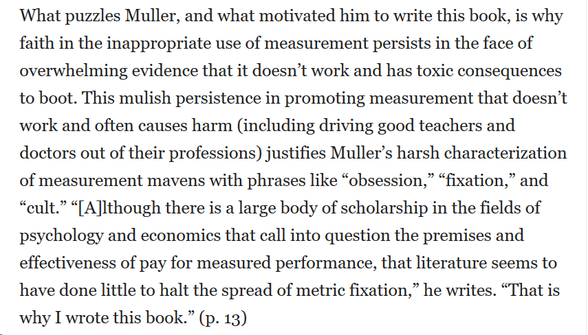 1/n "Le trouble obsessionnel de la mesure". Un résumé du livre du prof d'histoire Jerry Z Muller "the tyranny of metrics . thehealthcareblog.com/blog/2019/02/1… Cela a commencé par l'entreprise avec Taylor et le taylorisme mais, cela a été ensuite appliqué à la médecine , pour le pire.