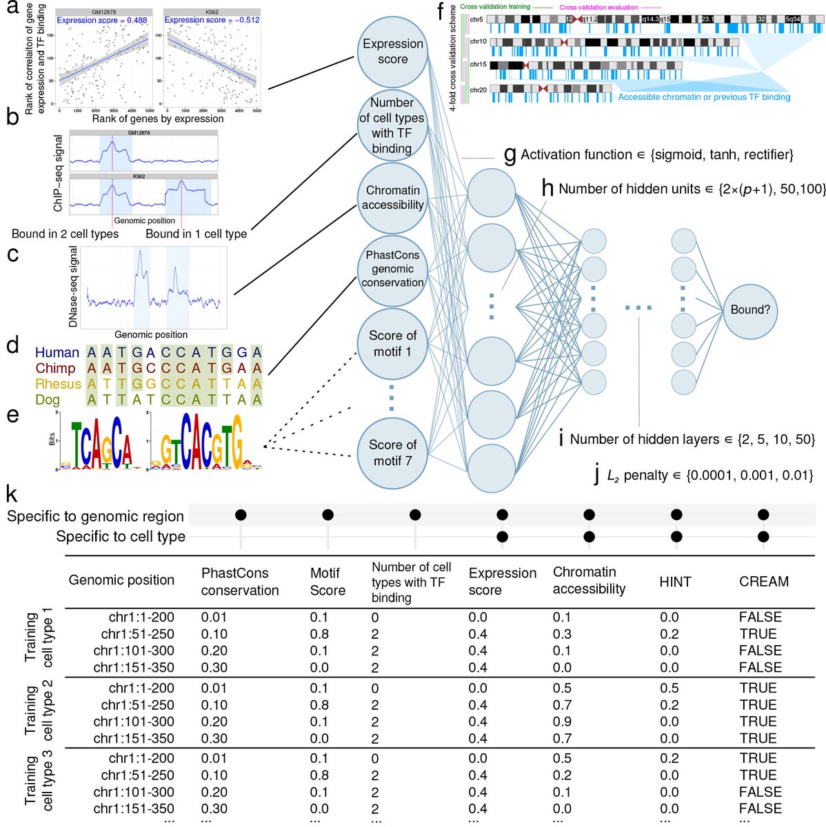 13/We combine these two new data types—the expression score and the number of cell types with TF presence at that locus—with other types previously used (chromatin accessibility, conservation, PWM score) as inputs to a neural network that predicts TF presence in a new cell type.