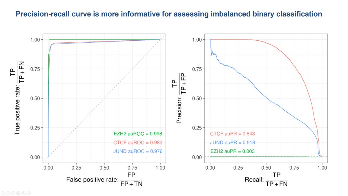16/We measure performance here with auPR, not the auROC widely used in the past. Our second-worst model for EZH2 actually has auROC of 0.998! But I don't advise relying on it. For most genomic classification tasks, it's time to leave this inflated and misleading metric behind.