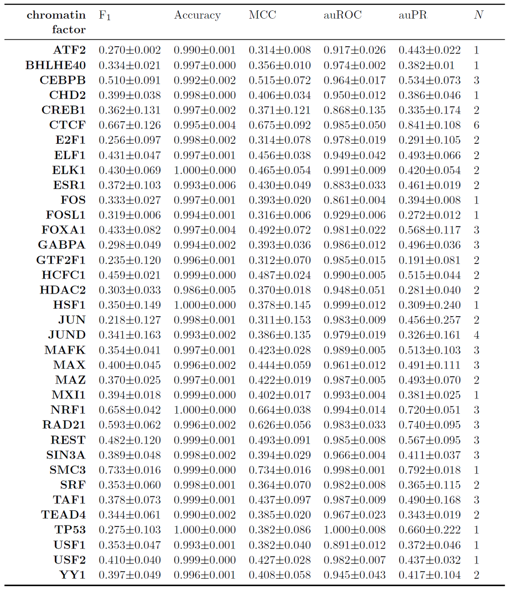 17/For our best 36 chromatin factors, we report a variety of benchmarks, including auPR, auROC, F1, accuracy, and Matthews correlation coefficient. You should always require multiple performance benchmarks. The trade-offs for each are different and can be instructive.