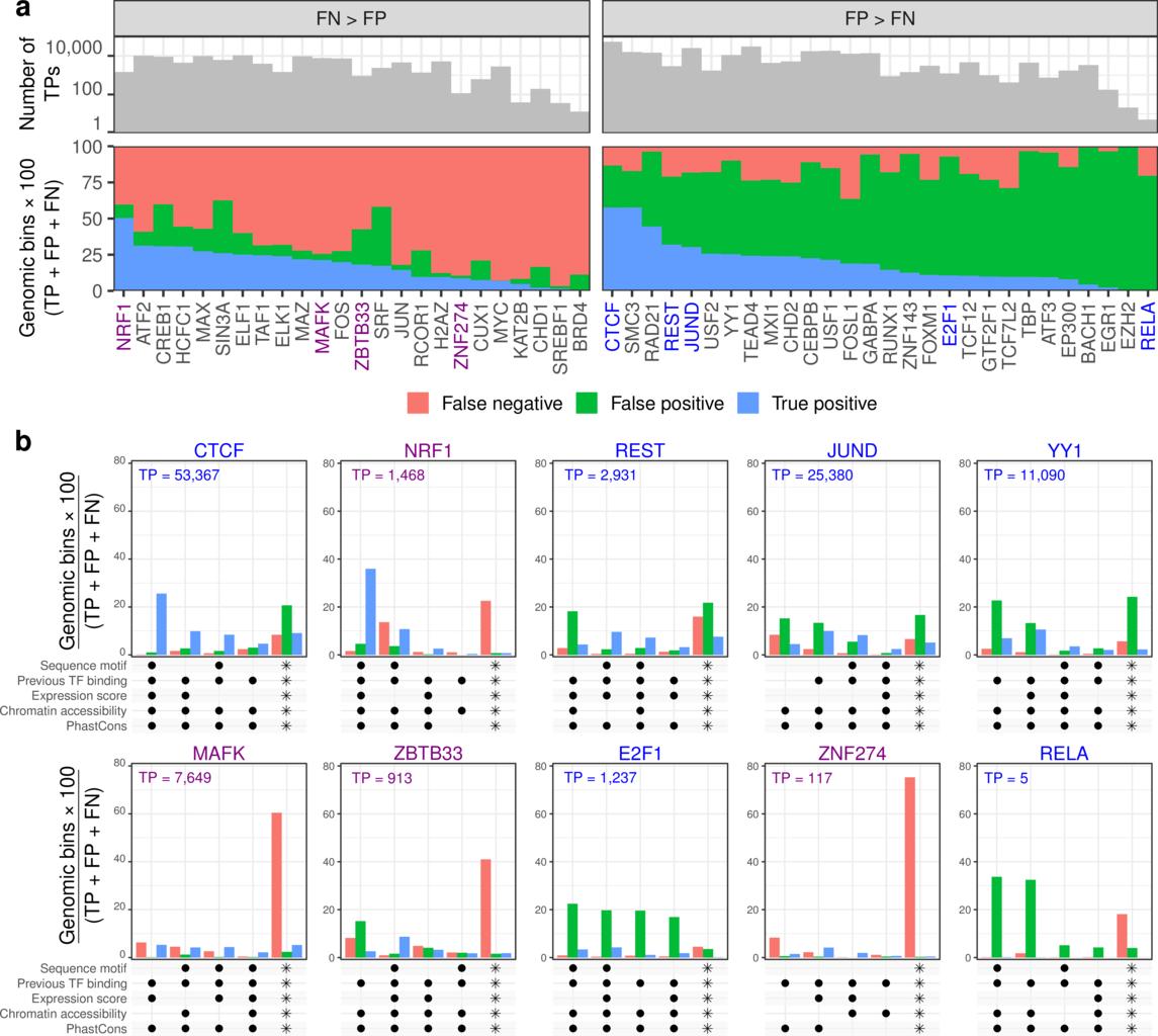 23/Looking into what features are most important for correct predictions, we find that varies a lot by model. For many, chromatin accessibility is essential, but for others it's not (like ATF2, REST, MAFK).