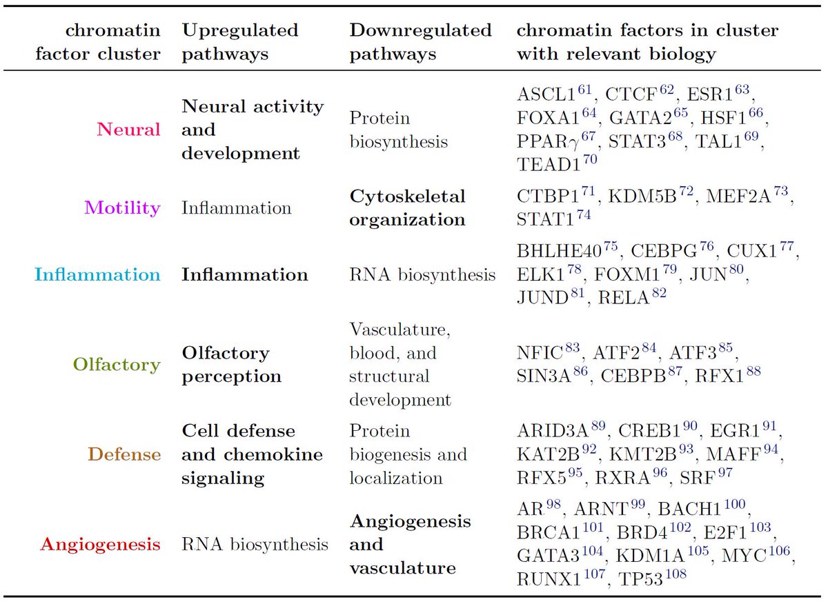 28/We accurately cluster the chromatin factors into functional categories based on the genes whose expression the factor's binding relates to.