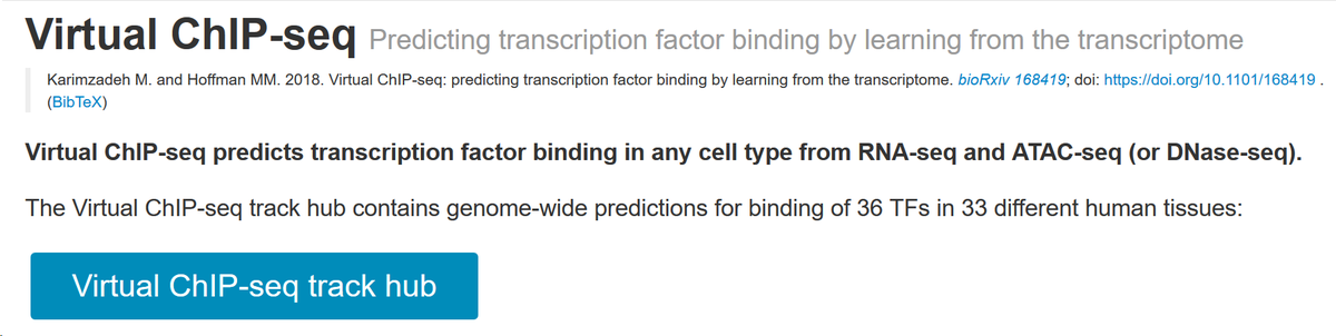 29/Finally, we've used our best-performing 36 chromatin factor models to make predictions on 33 different Roadmap Epigenomics human tissue types. You can load these in @GenomeBrowser just by visiting virchip.hoffmanlab.org and clicking the "Virtual ChIP-seq track hub" button.