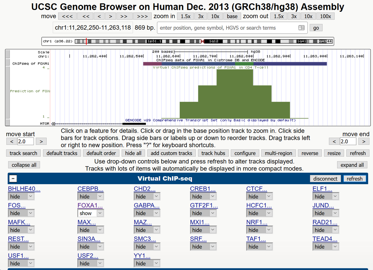 32/Voila, prediction of a FOXA1 binding site in the MTOR promoter in CD4 T-cells. No programming necessary. You don't even have to run the software yourself—all these predictions are ready for you to use now.