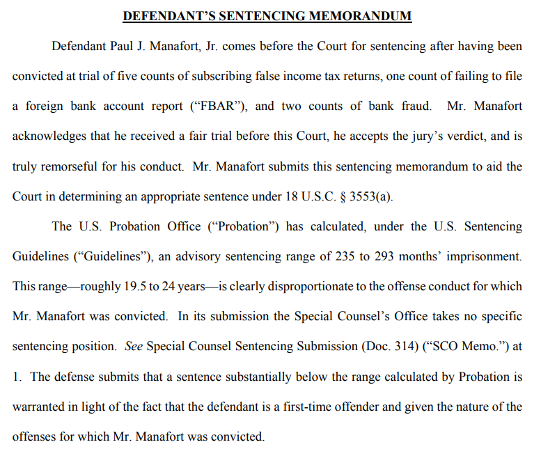 Manafort's lawyers clarified that their request for more time to file his sentencing memo in DC was *not* opposed by Mueller's office, and the judge granted the request. Manafort's memo is due 2/25, the govt's memo is still due Friday