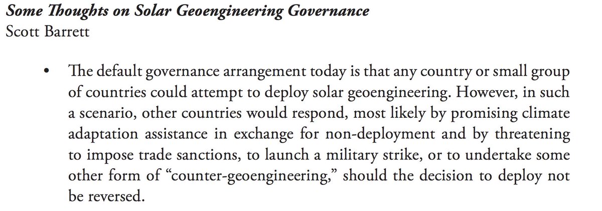 Is the Harvard geoengineering report writer here assuming that the country deploying solar geo is a smaller and/or poorer country (i.e. one that needs assistance, could be threatened militarily or with sanctions)? This scenario doesn't work if it were the US or China doing it.