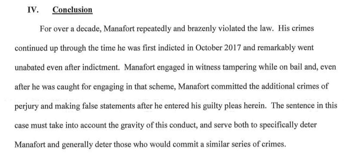 Mueller's office isn't recommending a specific sentence for Paul Manafort in his D.C. case, but it's clear they want a significant one. His "crimes continued up through the time he was first indicted in Oct. 2017 and remarkably went unabated even after indictment."