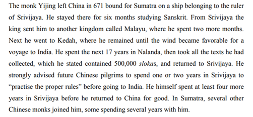 Yijing left cInadesha on a ship bound for shrIvijaya where he spent 6 months studying saMskRta & would hop between various S.E.Asian cities before he finally got a chance to leave for bhArata & would reach Nalanda, Bihar where he spent a good 17 years. iseas.edu.sg/images/pdf/nsc…