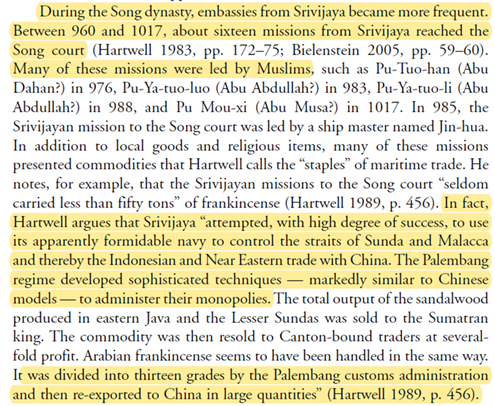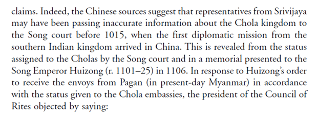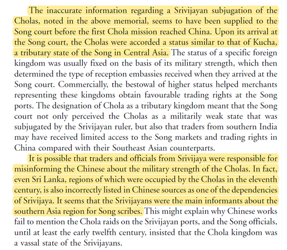 Sen explains that chOzha traders lost preferential access to Song markets as the cInas perceived them as a militarily weak dependency, having been “tricked” by the shrIvijayans into believing so. & even after the raids, the cInas continued (till 1106 as seen above) believing it!