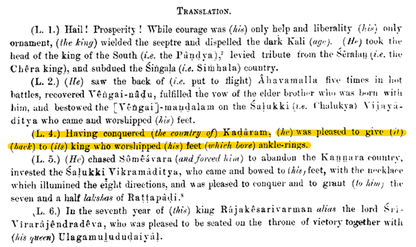 This is rather puzzling. Why would he send the chOzha military across the seas & then immediately reinstate the king? nIlakaNTha shAstri reads the inscription (SII, Vol.3, Inscription No.84) as indicating that vIrarAjendra reclaimed kadAram for the abdicated shrIvijayan ruler.