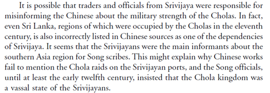 Sen surmises that for a century or even a little more, the shrIvijayans had been using their status as the primary entrepot/transit state to pass false data to the Song officials that the chOzhas were their vassals & had even done the same to siMhaladesha!