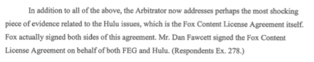In this $179 million decision against Fox, the arbitrator finds "shocking" evidence of unfair dealing when it comes to Hulu. "The obvious inferences of self- dealing, conflict of interest and the lack of any arm's length negotiations leap off the page," he writes.