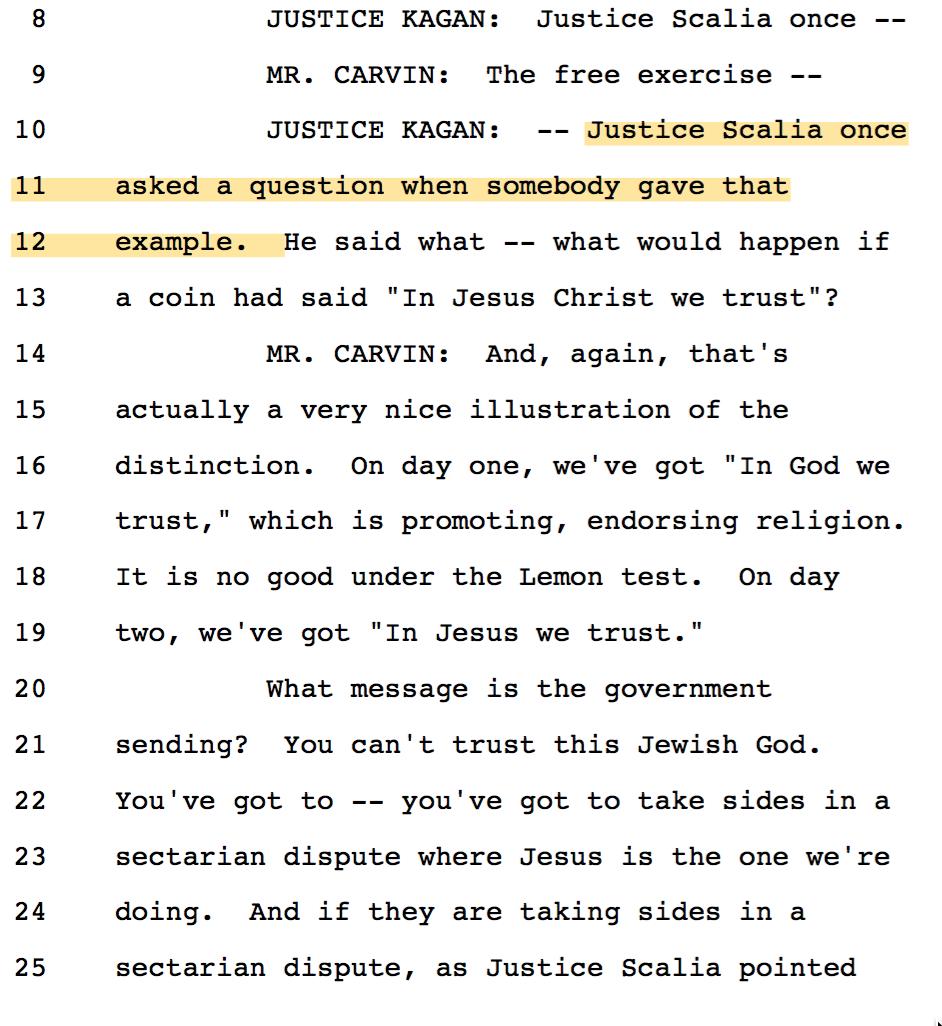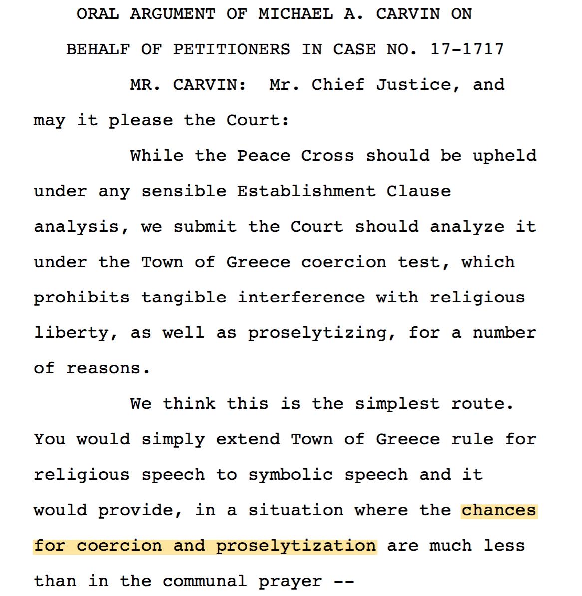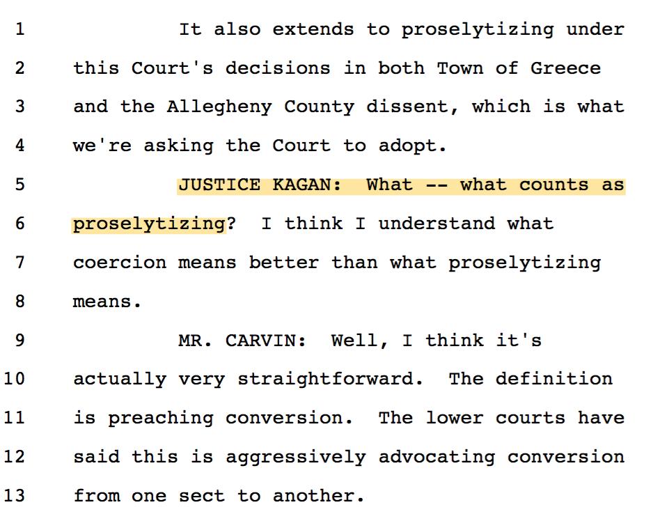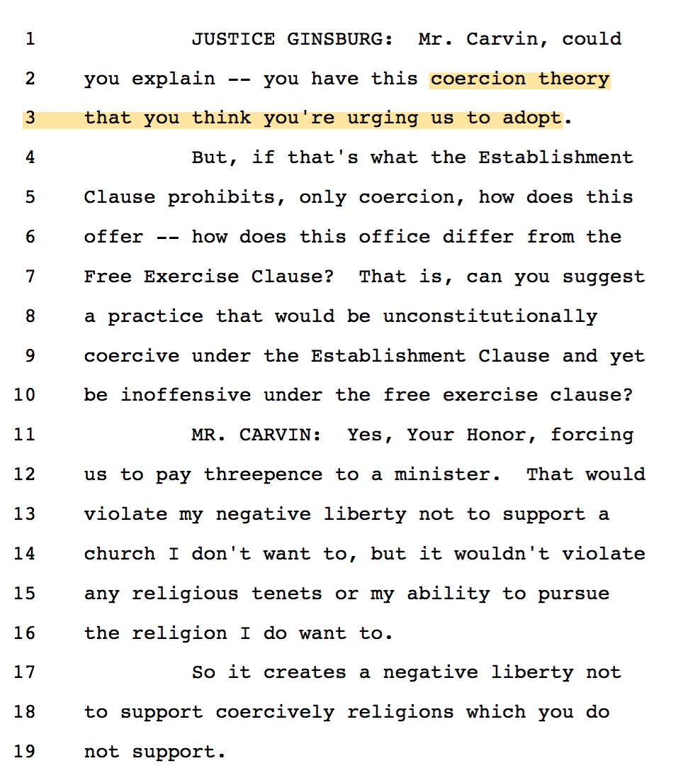 4/ Mike Carvin framed the "coercion" test as a test that prohibits proselytizing. The Justices struggled with this approach.
