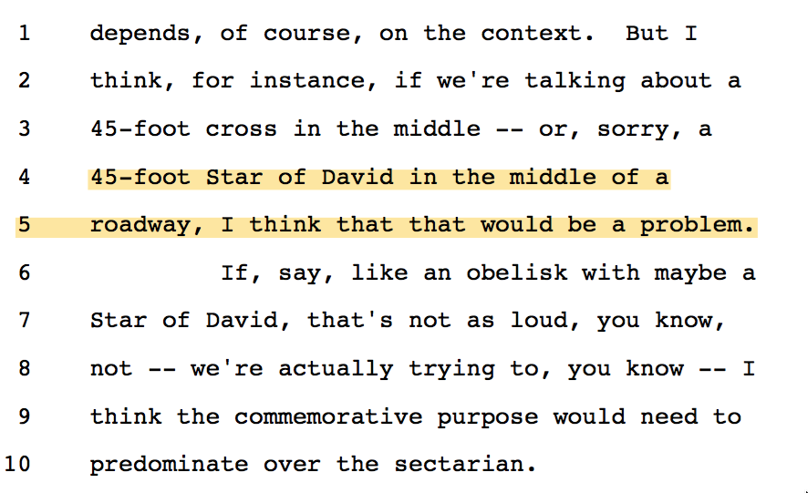 11/ Justice Breyer did not say a word until p. 62 of the transcript, halfway through respondent's argument. (His Van Orden concurrence was invoked a few times before). He must be struggling with this case, like he did in Van Orden. He does not want memorials torn down.
