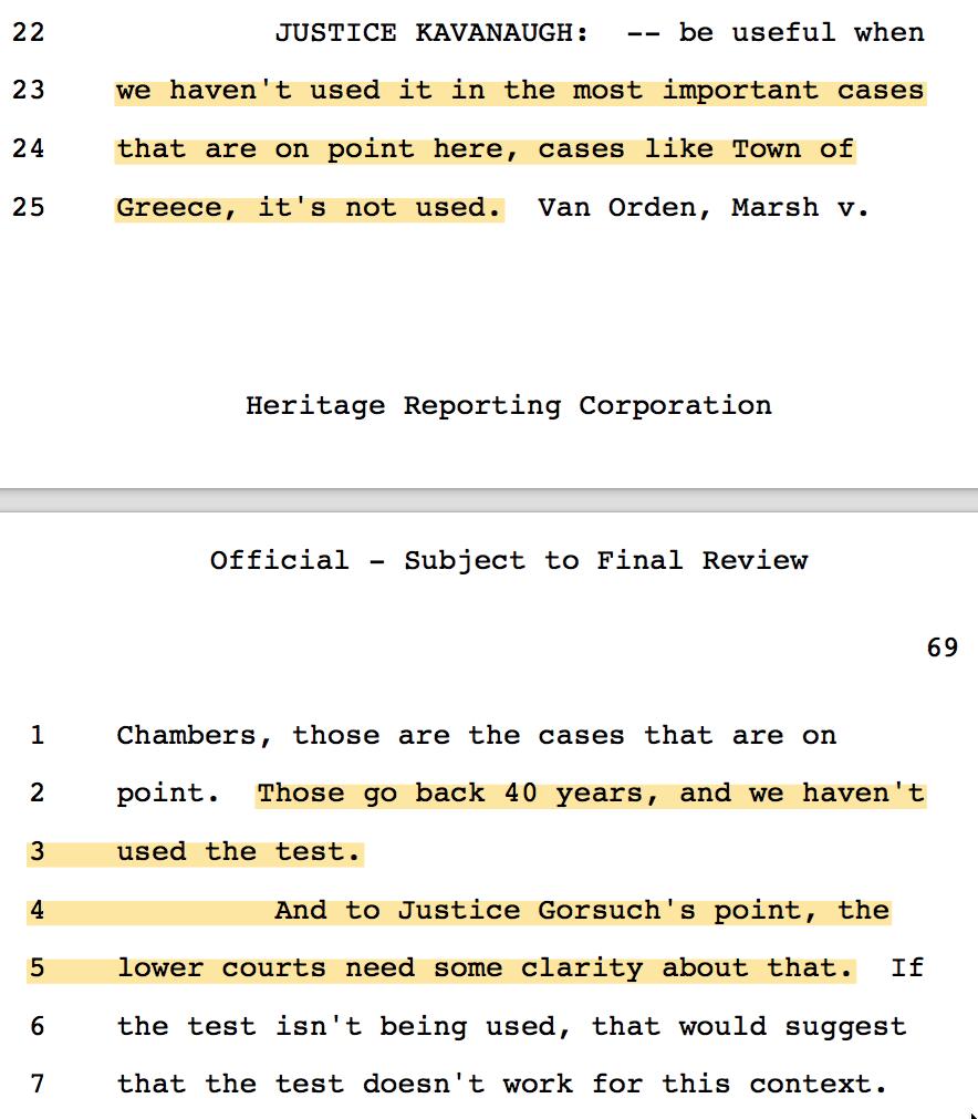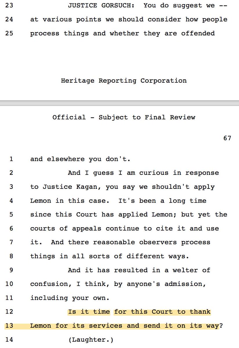 15/ Neal Katyal told Gorsuch that this case is not the right case to overrule Lemon. "Wait for a case in which it has some bite." (Neal gave a similar answer in Trump v. Hawaii concerning nationwide injunctions.)