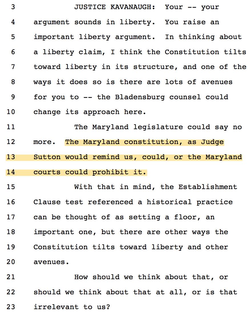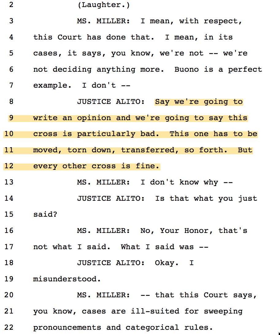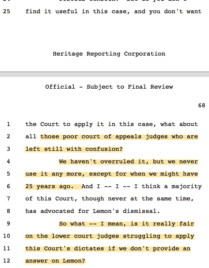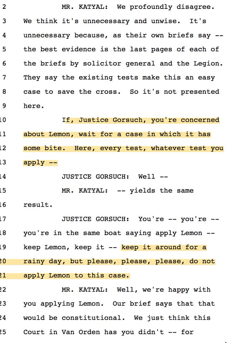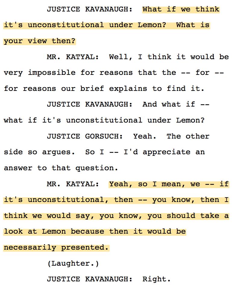 16/ J. Kavanaugh asked what would happen if the Court found the MD cross violated Lemon. Katyal demurred: "take a look at Lemon." + Laughter.