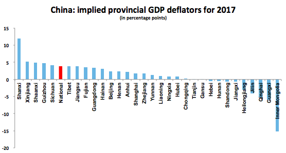 The appearance of negative GDP deflators in the past has been a red flag of provinces cooking the books: ie, Inner Mongolia, Liaoning, Tianjin. Based on this data, there are plenty of other suspects out there, including some big ones: Shandong, Chongqing and even Shanghai. (6/)