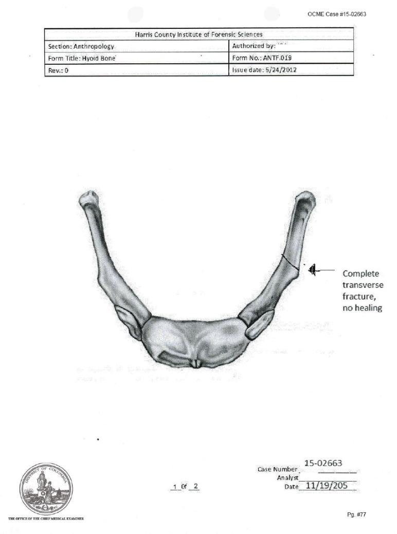 "I explained that the position of the hyoid is protected by the mandible and that fractures are commonly associated with hanging or manual strangulation."
