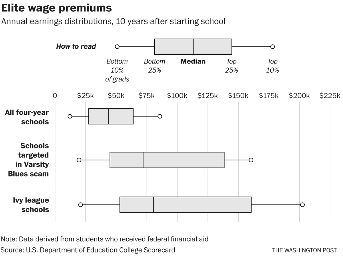 The median graduate of a U.S. college could expect a salary of about $44,000 a decade after they first enrolled. For graduates of the eight colleges involved in last week's admissions scam, however, the median 10-year salary is $73,000. washingtonpost.com/business/2019/…
