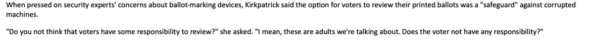 GA. Sen. @kirkpatrickdk 's condescending comments make no sense when she tells @ericgeller why she voted for BMDs which experts agree cannot generate auditable results. She believes that voters are responsible for testing the machine accuracy. Huh? and blames those of us ...1/