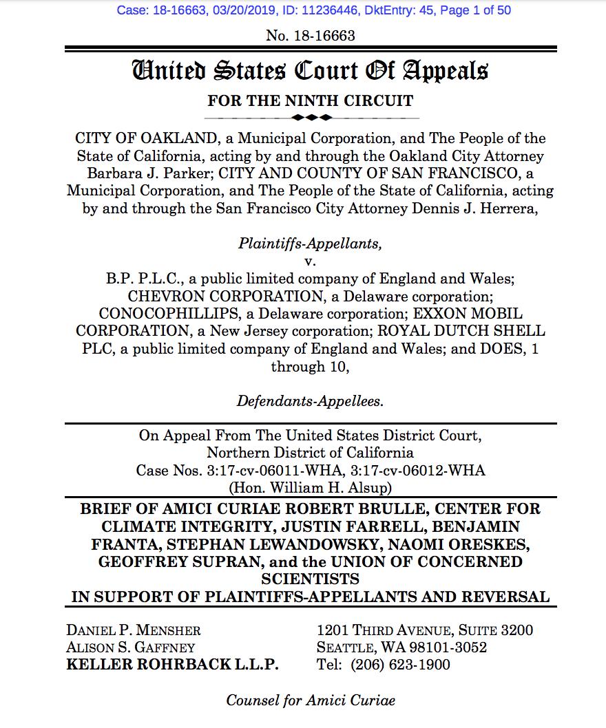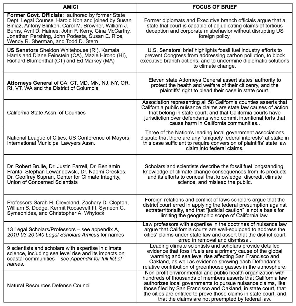 3/n: Our amicus brief is 1 of 10 in support of an appeal by San Francisco & Oakland seeking to hold fossil fuel co's accountable for climate damages. Other briefs from @JohnKerry, @AmbassadorRice, @GinaEPA & other fmr govt officials, 11 Attorneys General; 6 Senators; many others.