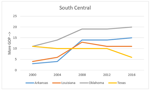 9. South central. Can see R strength drop in TX in 2016; other 3 states getting much redder