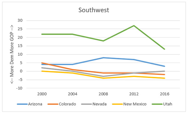 8. Southwest: NV remains bellwether. AZ trending D, although not that much if compared to 00-04. CO & NM getting bluer. UT still blood red, just that Romney was so strong there (for obvious reasons) and Trump so relatively weak (+ McMullin, not reflected here b/c just 2-party)