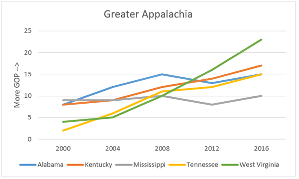 11. Greater Appalachia: Democratic bloodbath over the century. Look at that line in WV! MS largely stagnant while other 4 (even AL) moving considerably right since start of century