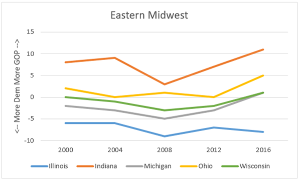 11. Eastern Midwest: IL & IN represent the Midwest's partisan extremes. MI & WI came into convergence in 16 after MI was generally more D earlier. Sharp R move for OH in 16 also seen here, though not quite as visually striking as IA b/c of 2000
