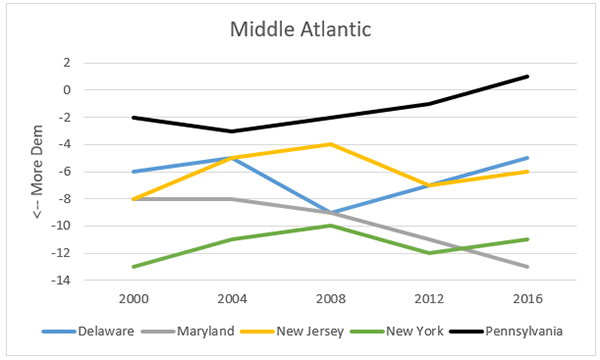 13. Middle Atlantic - PA a bit bluer than nation until 2016. Not much of note elsewhere - MD is the one state here clearly getting more D, the others not so much