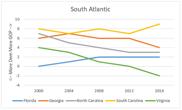 12. South Atlantic. VA trend toward Ds clear here; GA & NC trickling a bit that way too but they have further to go b/c even at start of century they were more R than VA. FL a little right of nation; SC not trending much