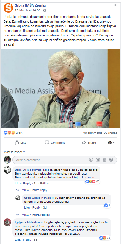 Vidim da je juče o temi pisao i @BalkanInsight i lajna generalno reagovala. Zaključak: iza FB strane Srbija NAŠA Zemlja se, bez preteranog uvijanja, krije breitbart.rs koji donosi svoju uređivačku politiku na ove prostore.