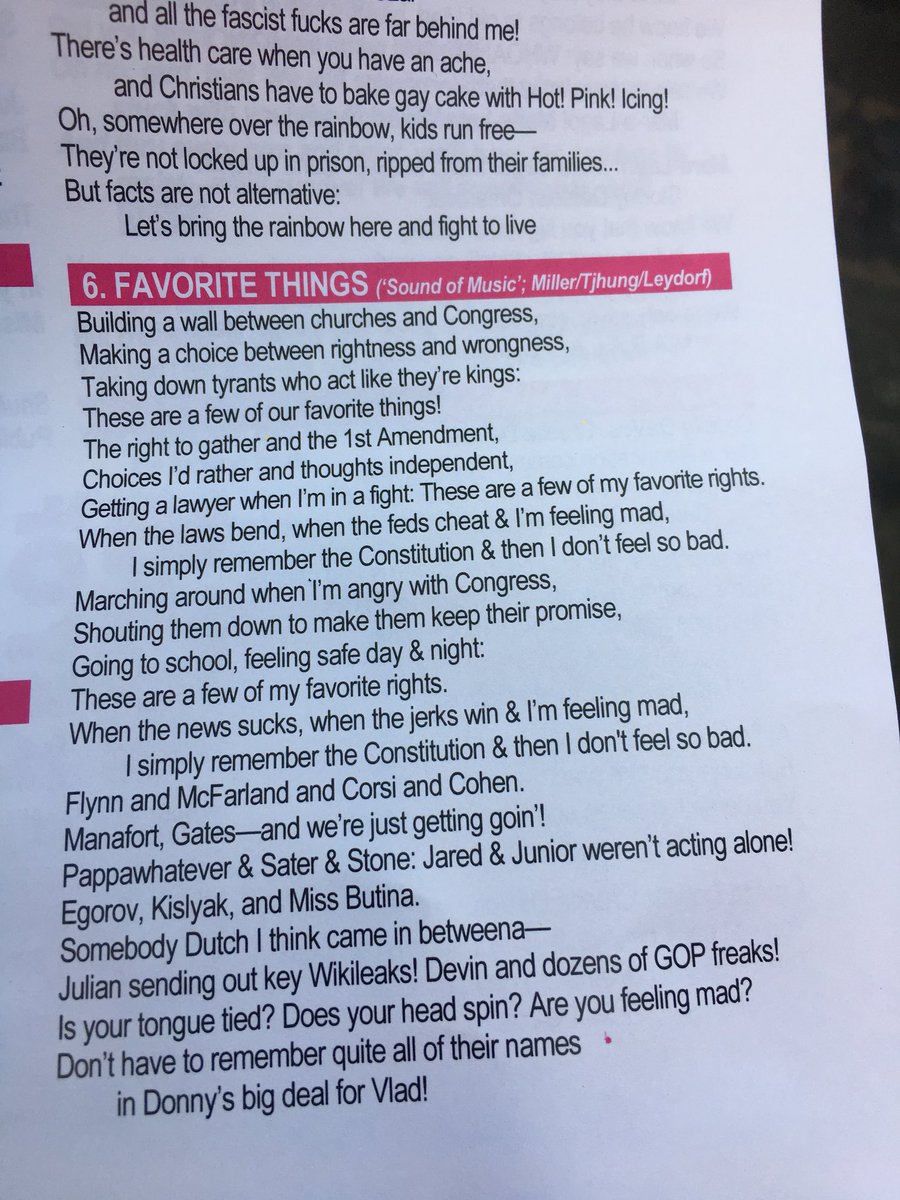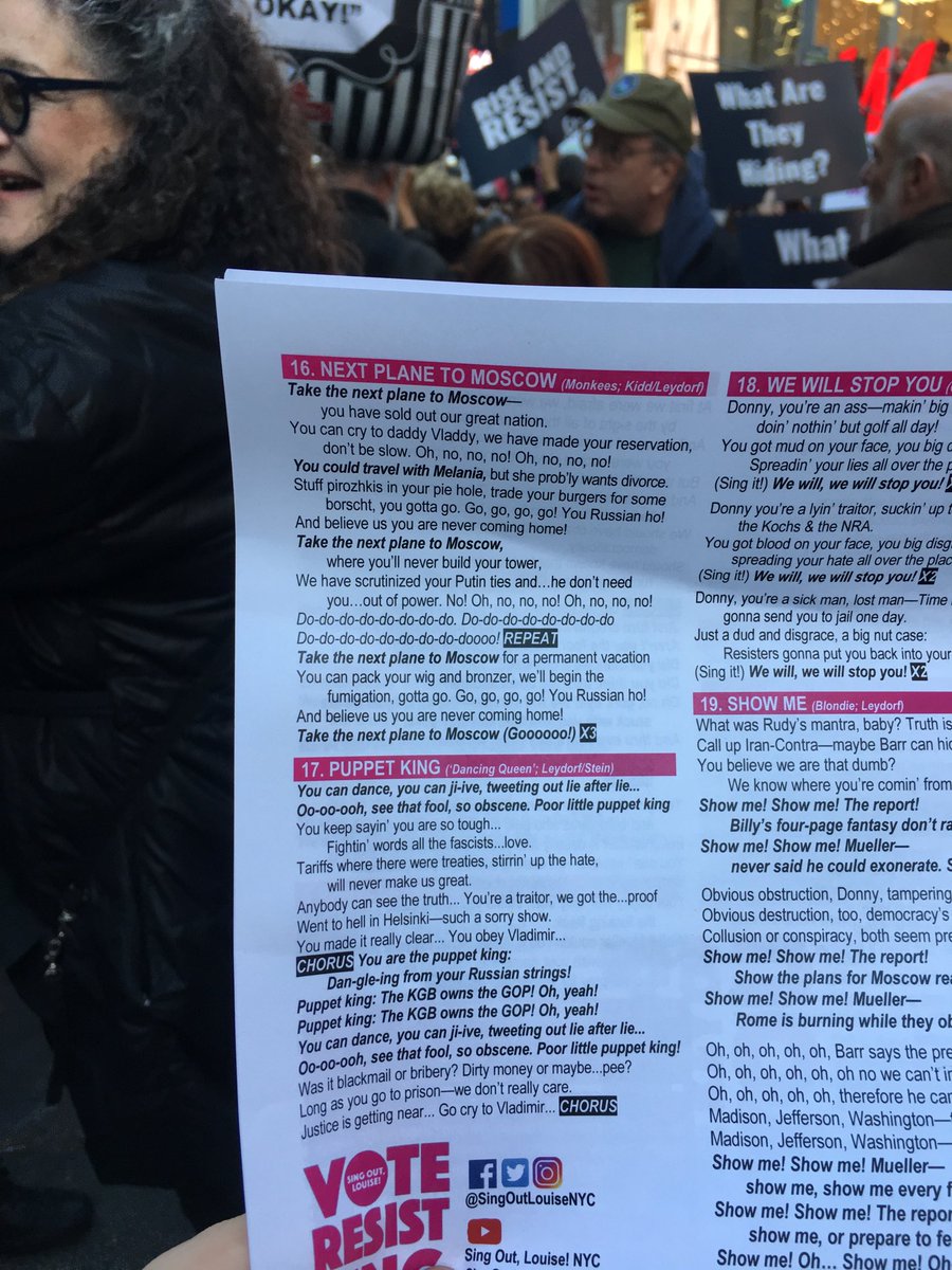 The pro-Mueller ralliers in Times Square have distributed this songbook. They are currently leading a mass singalong. Please read these lyrics