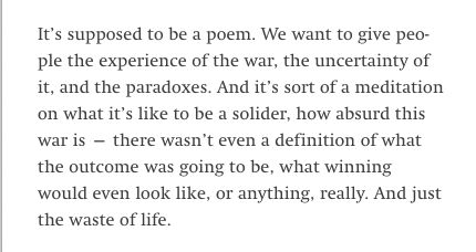 What's unique about the film is its footage -- raw scenes of soldiers killing, getting killed, getting high, abusing civilians, etc. There's no narration, just a montage of naked war the likes of which you've probably not seen. "It's supposed to be a poem," Lagoze says.