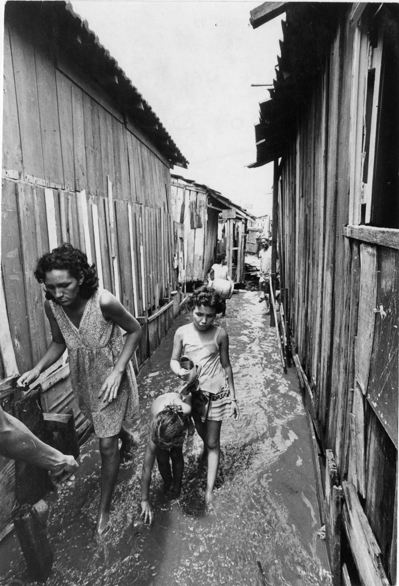 Na favela da Maré, em 1979, no outro lado da Zona Norte, uma família caminha entre vielas alagadas. Até hoje as comunidades são algumas das áreas mais afetadas pelas chuvas, dada a proximidade com encostas e a ausência do poder público.