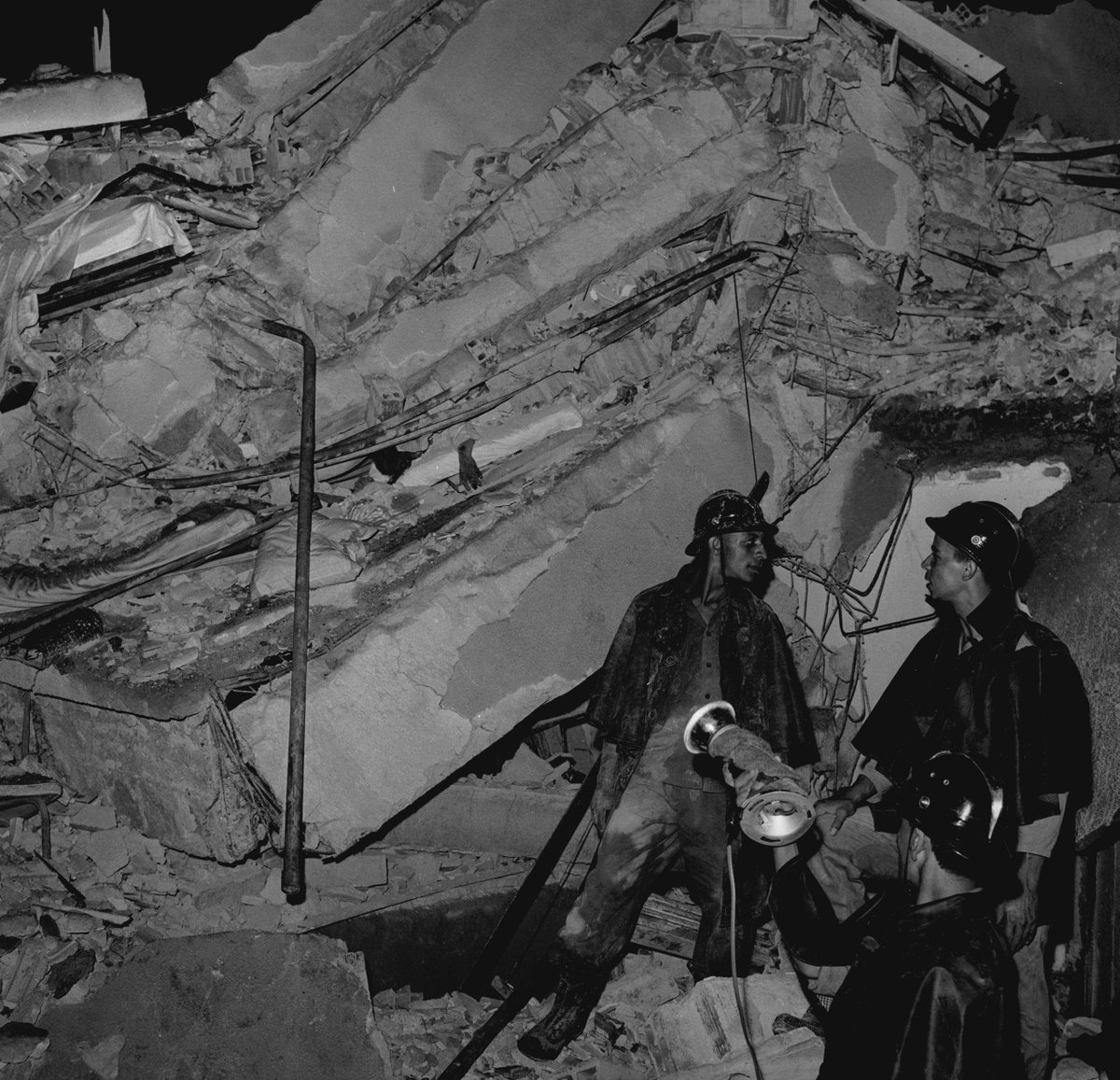 Desabamentos eram comuns. Nesta foto, socorristas posam ao lado dos escombros de um prédio em Laranjeiras, Zona Sul do Rio, que caiu em 1967. Naquela data, mais de 200 cariocas morreram, inclusive o irmão do dramaturgo e jornalista Nelson Rodrigues.