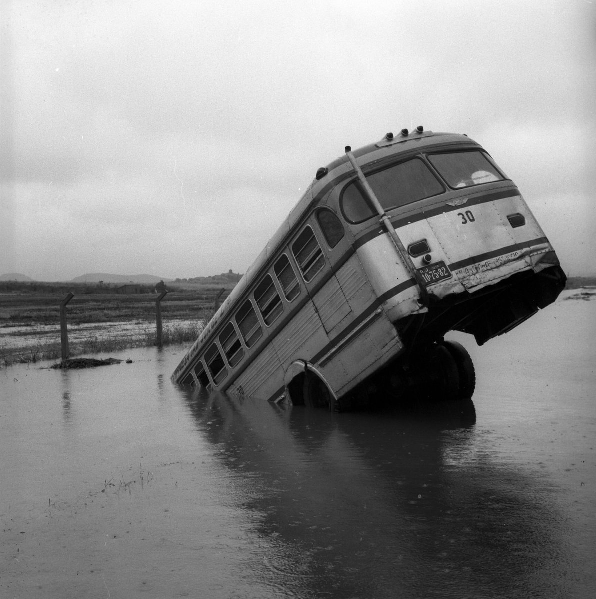 Veículos também sofrem com a força das correntezas. Neste registro, clicado em 1959, um ônibus ficou preso em um canal entre a rua General Savage e o Campo dos Afonsos, no bairro Santa Cruz, Zona Oeste.