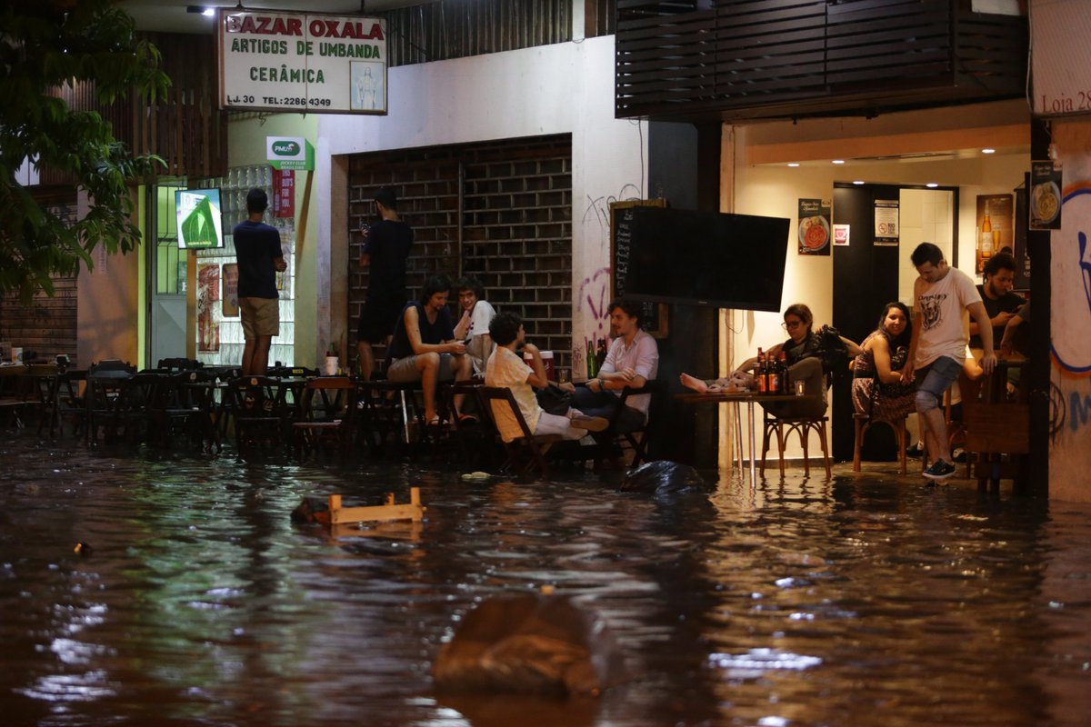 Os bares costumam ser pontos concorridos pelos cariocas. Muitos deles, inclusive, não se deixam abalar pelas enchentes e continuam tentando aproveitar a noite jogando conversa fora. Neste registro de 2018, jovens aguardam diminuição da água em um bar em Botafogo, Zona Sul.