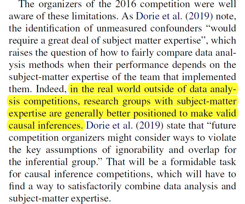 Corollary: As much as we love data analysis competitions, they aren't a good fit for causal inference.