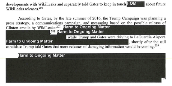 Notably, the part of the report that contains evidence about Trump campaign outreach to WikiLeaks section of the report is one of the most heavily redacted sections, largely for potential harm to ongoing matters (see, e.g., the Roger Stone case). Here is a representative sample.