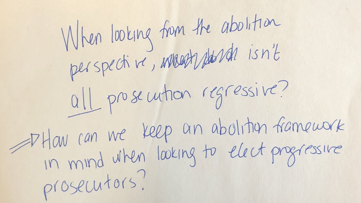“When looking from the abolition perspective, isn’t *all* prosecution regressive? How can we keep an abolition framework in mind when looking to elect progressive prosecutors?”