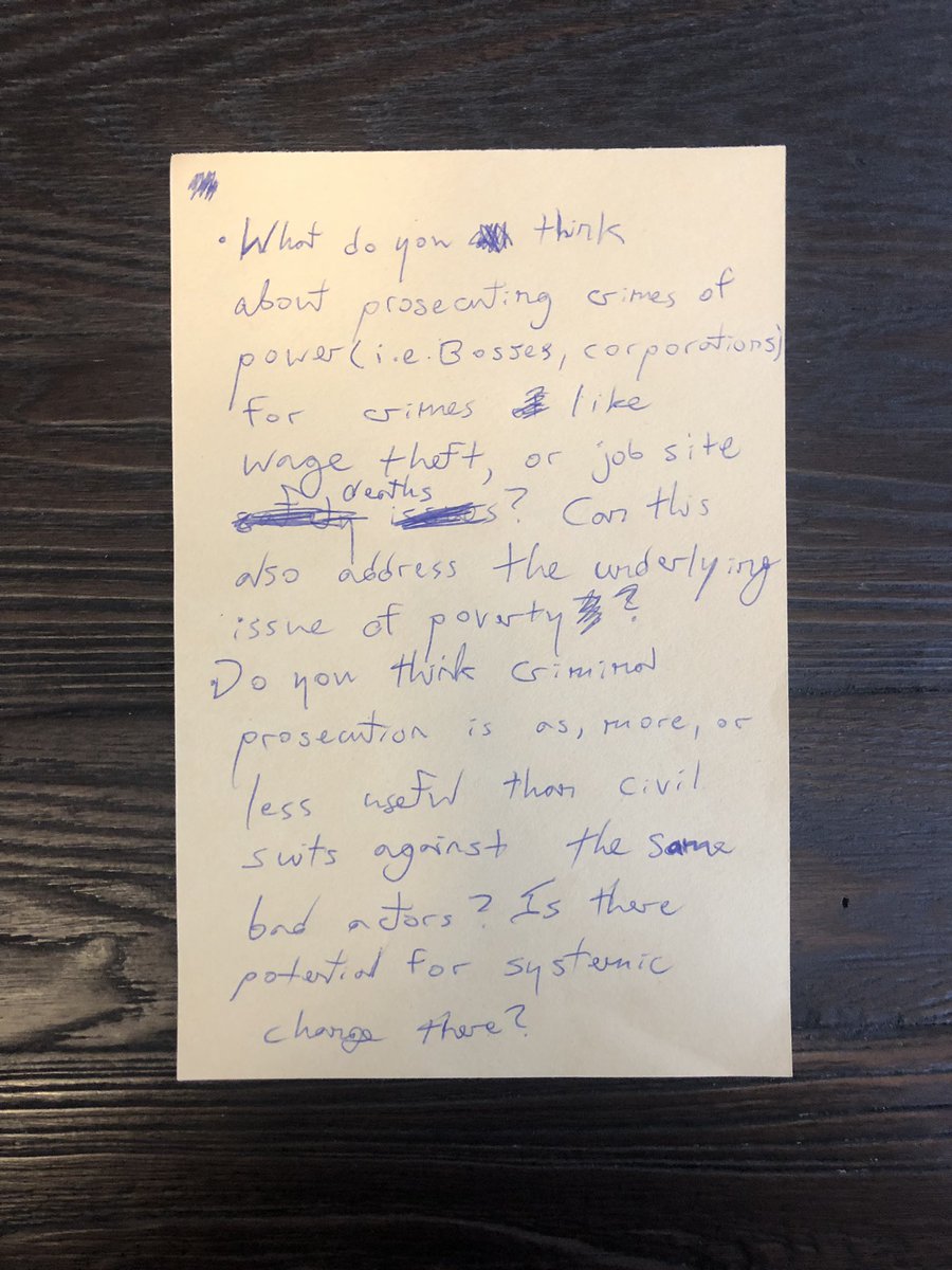 “What about prosecuting crimes of power (bosses, corporations) for crimes like wage theft, or job site deaths? Can this address the underlying issue of poverty? Do you think criminal prosecution is as, more, or less useful than civil suits against the same bad actors?”