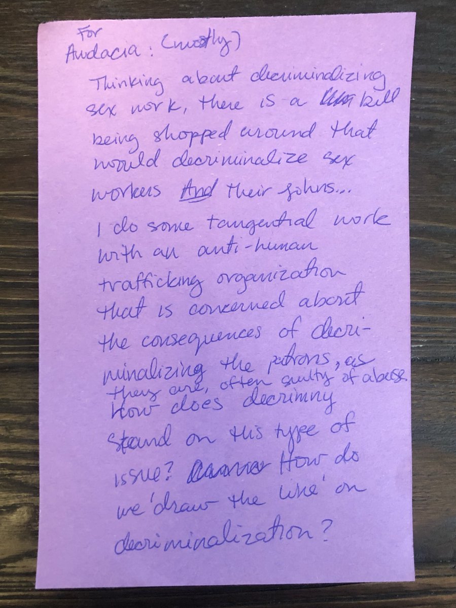 “Thinking about decriminalizing sex work, there is a bill being shopped around that would decriminalize sex workers AND their johns. Where do [should] we draw the line on decriminalization?”
