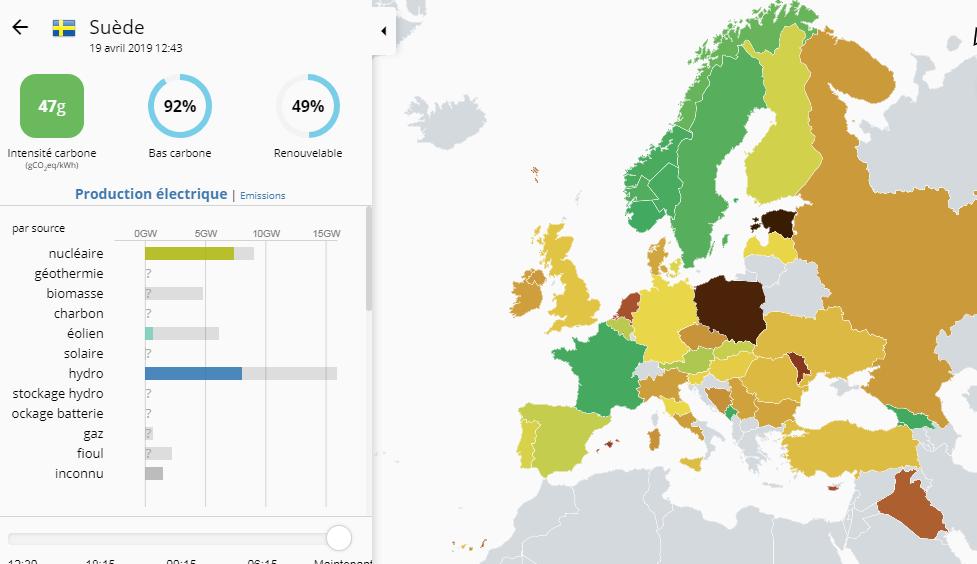 J'allais oublier de montrer la Suède, qui est un peu notre "cousine" sur le mix énergétique, avec beaucoup de nucléaire et énormément d'hydro (ils ont le territoire pour). 47g actuellement, 92% de décarboné.