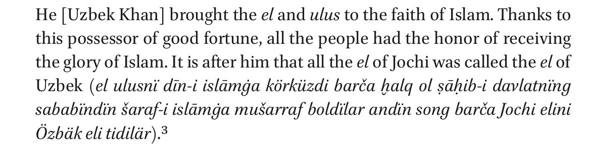 The ethnonym “Uzbek” was first applied to the nomadic population of the Golden Horde after Uzbek Khan (r. 1313–41) made Islam the religion of state. The Jochid Ulus became the Uzbek Ulus.
