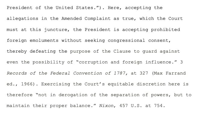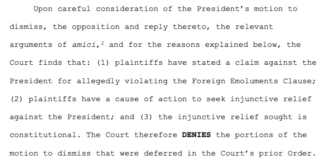 Sullivan also rejected Trump's args that individual members of Congress, as opposed to Congress as a whole, couldn't sue to enforce their authority (the Foreign Emols Clause says the pres can't accept emols w/out Congress' approval), and that the court shouldn't get involved