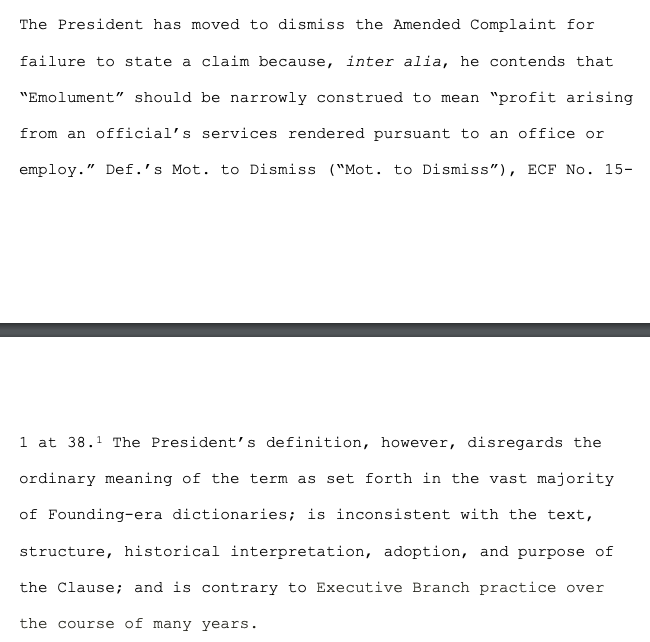 Trump has argued for a narrow definition of "emolument" — if he gets $/something of value for doing something in his official capacity. Congressional Dems (and DC and MD, in the MD case), argued for a definition broadly covering profits/gains. Two judges have agreed w/ the latter