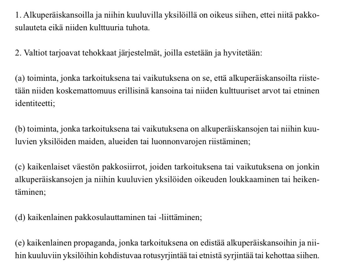 4/4 #Jäämerenrata yhteydessä on ihan perusteltua puhua kulttuurisesta kansanmurhasta. Se ei kuitenkaan ole juridinen termi kun YK:n alkuperäiskansajulistuksessa vastaavat asiat on kielletty toisella nimellä "kulttuurin tuhoaminen". Tässä vielä julistuksen 8 artikla myös suomeksi