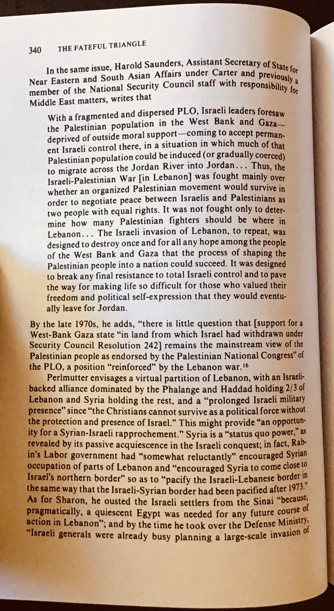 US official: Israel’s invasion of Lebanon was designed to destroy “hope among the people of the West Bank and Gaza that the process of shaping the Palestinian people into a nation could succeed...[and to make] life so difficult for...[them] that they would...leave for Jordan.”