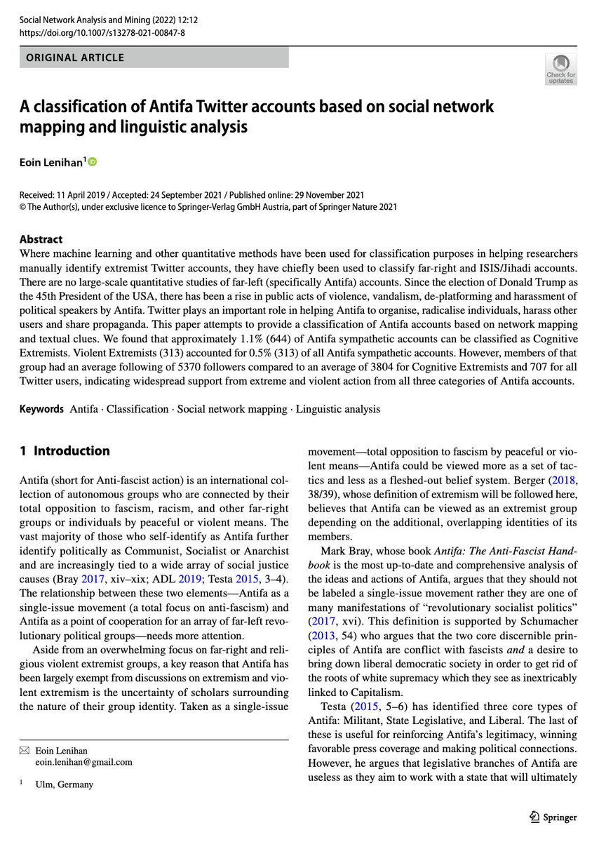 Some people are interested in my work on Antifa. So here's a short thread with some highlights. In 2022 I published the largest peer reviewed academic study to date of how Antifa use social media to organise real world violence. You can read it without paywall here.